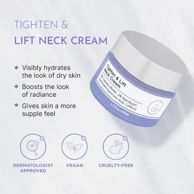 Feel like sagging. crepey skin is adding years to your appearance? Our Tighten & Lift Neck Cream is your answer. Packed with advanced firming agents and nourishing ingredients. it's your ticket to restoring skin elasticity and structure. Say goodbye to sagging and hello to a firmer. lifted neck in weeks. Ready to turn back the clock by up to 10 years? Try it now!
